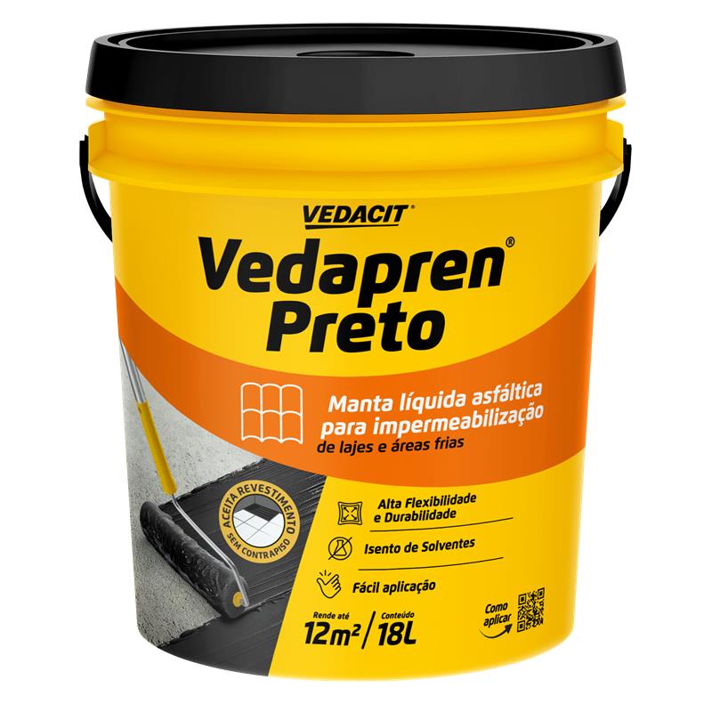 Descrição VEDAPREN é uma manta líquida à base de asfalto e secagem de 6 horas entre demãos. É aplicada a frio, pronta para uso e moldada no local. É indicada para lajes transitáveis, áreas cobertas molhadas e molháveis desde que sejam posteriormente revestidas com cerâmica ou proteção mecânica (contrapiso). Cobre a estrutura com uma proteção impermeável, apresenta ótimas características de elasticidade e tem uma boa durabilidade.